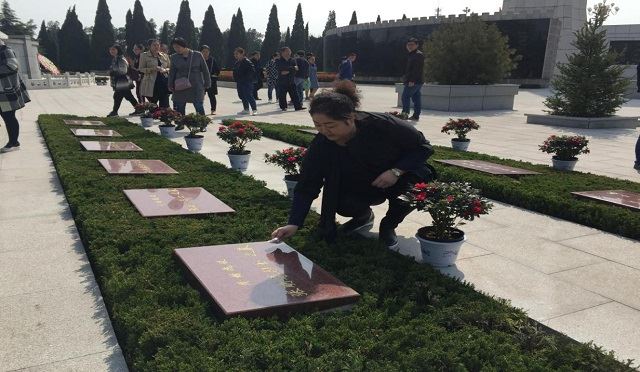工会主席张煜擦拭墓碑 (拍摄于2018年3月30日)