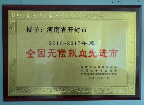 全国无偿献血先进城市每两年评选一次。今年世界献血者日前夕,国家公布了第十届全国无偿献血先进城市的名单。我市再次荣获“全国无偿献血先进市”称号,这已经是我市连续10 届获得此项殊荣了。同时,国家还公布了获得国家无偿献血先进个人金奖、银奖、铜奖人员名单。我市660 人获金奖,751 人获银奖,2371 人获铜奖。开封市中心血站获得“ 全国无偿献血先进单位”称号。