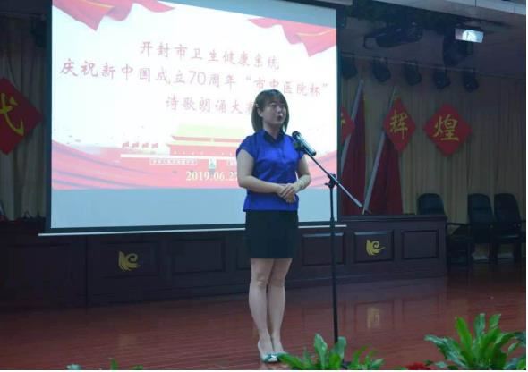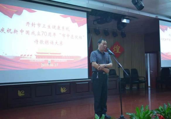 2019年6月27日下午,市中医院五楼报告厅内,市卫健系统的15家医疗卫生单位齐聚一堂,用诗歌朗诵的形式,向建国70周年献礼!通过抽签敲定各单位上场秩序。随着主持人的上场,诗朗诵拉开帷幕,各单位选手精神抖擞,服装整洁,大方得体,每个人都慷慨激昂的诵读着自己的作品。