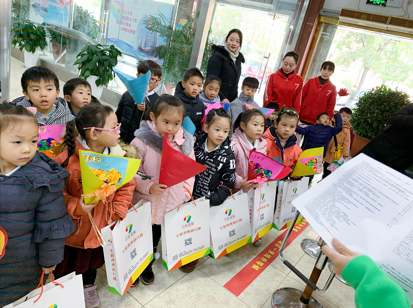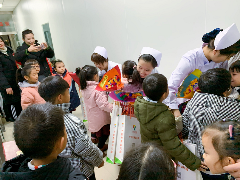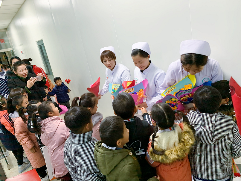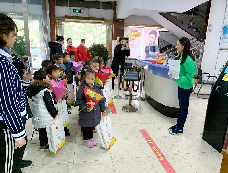 2019年11月28日是感恩节,开封市七彩未来幼儿园的小朋友们提前做好了精美的手工手捧花,来到了开封市中心血站为还在辛苦忙碌的护士阿姨们献上了自己的一份祝福,并且在血站讲解员的带领下参观了采血大厅,参观期间小朋友们问了许多天马行空的问题,对无偿献血非常好奇非常感性趣,还七嘴八舌的告诉护士阿姨长大了也要来献爱心。