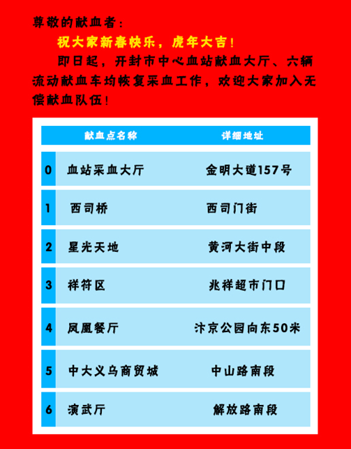 赓续碧血丹心,坚持本色担当。为了保障春节期间全市医疗临床用血,开封市中心血站采血工作已开启,血站采血大厅正常上班,市内流动献血车从即日起均恢复献血服务,欢迎广大市民加入无偿献血队伍。开封市中心血站党支部书记、站长李振东同志代表全站职工和获得救治的所有病患及家属向关心和支持我市无偿献血事业的各级领导以及广大无偿献血者和社会各界爱心人士,表示衷心的感谢并致以崇高的敬意!让我们共同守卫这座城市的“红色生命线”。