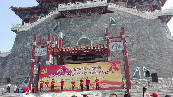 为进一步深化我市党员志愿服务活动,促进“两学一做”学习教育深入开展,我市2016年6月26日上午在宝津楼广场举行了“做志愿表率、为党旗增辉”党员志愿者进社区集中服务月活动启动仪式。全市16家单位参加启动仪式,血站代表市卫计委参加了此次活动。