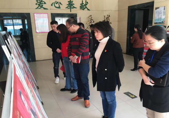 2019年3月12日血站大厅展出“改革开放40周年”宣传展版,图为党员干部在集中观看