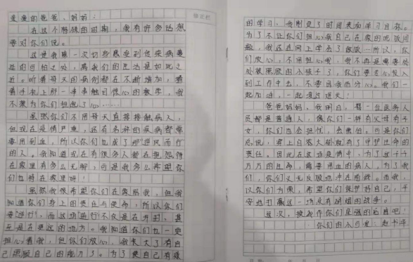 "你们义无反顾的冲在前线,我为你们为荣,希望你们保护好自己,平安的打赢这一场没有硝烟的战争,这次换我做你们坚强的后盾吧!"这是血站职工的女儿赵书华写给爸爸妈妈的一封信,他们是宣教科科长赵景森和体采二科采血组长相楠。