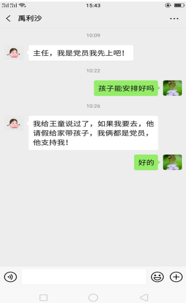 为顺利完成这项工作任务,成分科需要指派一名工作人员配合参与新冠肺炎康复献血者血浆采集工作。因成分科青年女职工较多,且职工的孩子年龄尚小。站组织考虑到职工及家属安全,建议让孩子稍大点的职工参与进来。科长柳红梅向科室传达工作指令后,禹利沙首当其冲报了名,她给柳红梅发信息说:“主任,我是党员,我先上吧。”“孩子能安排好吗?”柳红梅回复“我给王童说过了,如果我去,他请假在家带孩子,我俩都是党员,他支持我。”禹利沙与科长柳红梅的这段聊天,瞬间感动了血站全体职工,全站纷纷给禹利沙点赞。