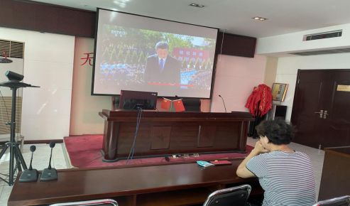 2020年9月3日上午血站党支部组织党员干部职工观看纪念中国人民抗日战争暨世界反法西斯战争胜利75周年向抗战烈士敬献花篮仪式
